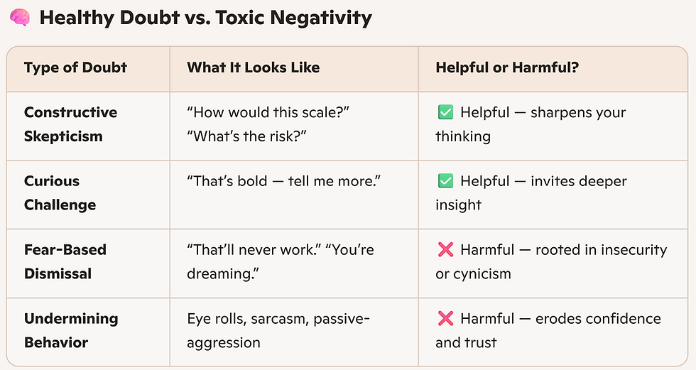 Doubt is sneaky. It can come from anywhere: your environment, your support circle, the economy, your education, your time, your responsibilities. The people around you—friends, family, colleagues—play a huge role in either fueling your confidence or feeding your uncertainty. A strong support circle can be a launchpad, but it can also be a trap. We all want encouragement, but there’s a difference between genuine support and “yes” people who never challenge you. The real magic happens when you surround yourself with a mix of encouragers and people who offer healthy doubt—the kind that sharpens your thinking rather than shuts you down.